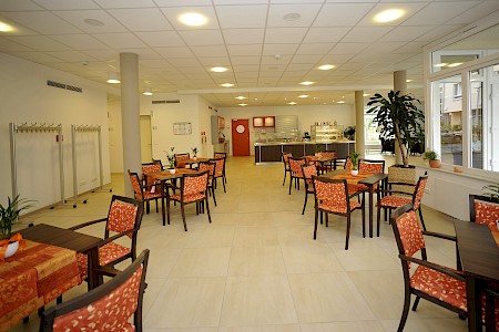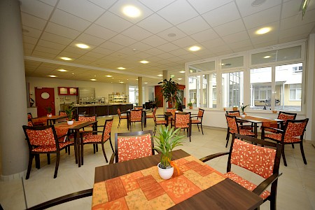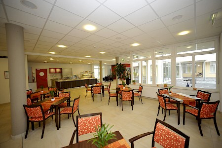 Alle Mahlzeiten können in netter Tischgemeinschaft eingenommen werden. Im Bedarfsfall wird auch Spezialkost angeboten (z.B. hochkalorische Kost, vegetarische Kost). Im Rahmen einer Speiseplanbesprechung können Sie unserem Chefkoch Rückmeldung zu den Speisen geben, Wünsche äußern und so Einfl uss auf den Menüplan nehmen. An sieben Tagen in der Woche ist unsere Cafeteria für die Bewohner, deren Freunde, Bekannte und Angehörige sowie für andere Gäste geöffnet. Angeboten werden warme und kalte Getränke, Eis und Kuchen.