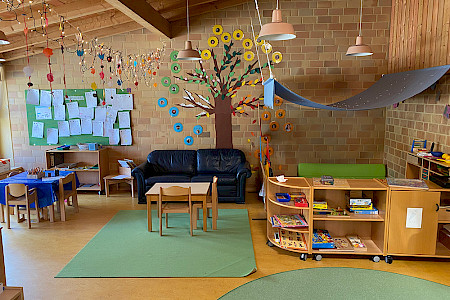Jede Gruppe besitzt einen Haupt- und Nebenraum sowie einen eigenen Wasch- /Toilettenraum und einen eigenen Ein- und Ausgang zum Außengelände. In unserem großen Flur finden u.a. gruppenübergreifende Angebote statt. Auch das Mittagessen wird dort eingenommen. In der Turnhalle treffen wir uns, neben dem regelmäßigen Turnen (jede Gruppe hat einen eigenen Turntag), für Feste und Feierlichkeiten. Auf der Empore haben wir Raum für unsere Vorschulkinder geschaffen, die sich an ausgewählten Spielen üben können, kleine Experimente ausprobieren dürfen und es sich bei einem Buch gemütlich machen können. Auf unserem großen Außengelände finden die Kinder viele Möglichkeiten, ihrem Bewegungsdrang nachzukommen und sich ordentlich auszutoben. Unebenes Gelände fordert die Grobmotorik der Kinder heraus und der riesige Sandkasten mit seinem „Piratenschiff“ lädt zum fantasievollen und ausgiebigen Spielen ein. Auf der „Straße“ können die Kinder mit den Fahrzeugen herumflitzen.